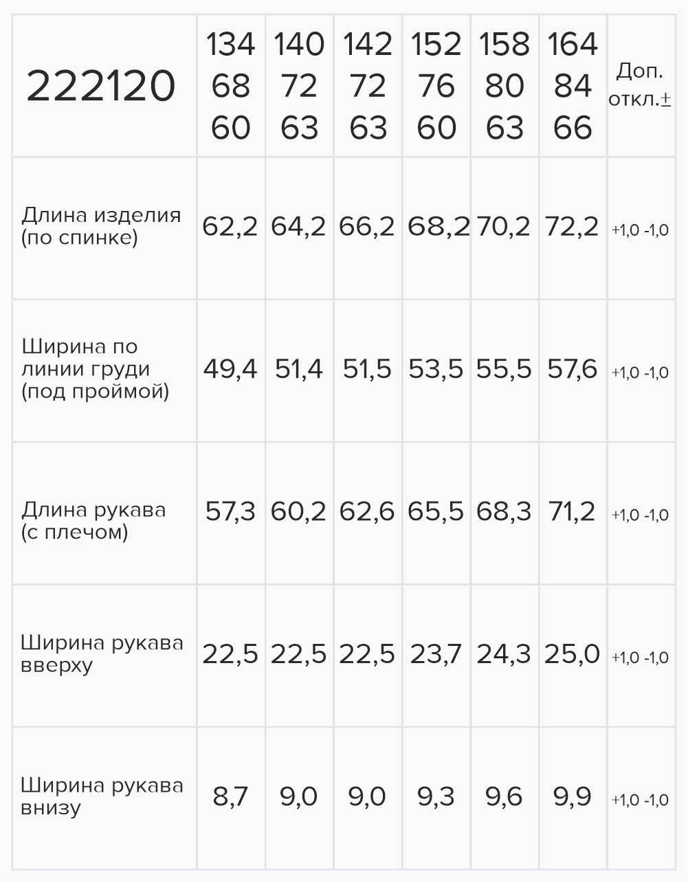 | Обхват груди, см | 56 | 60 | 60 | 64 | 64 | 68 | 72 | 72 | 76 | 80 | 84 | 84 | 88 | 92 | 88 | 92 |