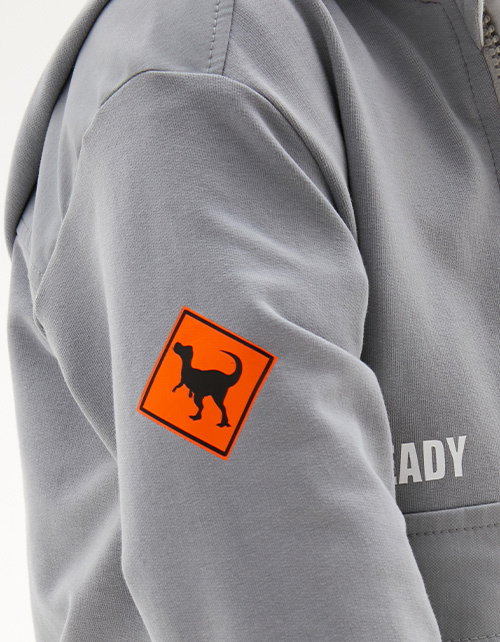 Зип-худи серо-зелёного оттенка. Прямая объёмная модель. Приспущенная линия плеча. Эластичные манжеты и низ изделия. Накладной карман-кенгуру с клапаном. Контрастная декоративная подвеска на молнии. Комбинация материалов: футер и твил. Авторский декор.